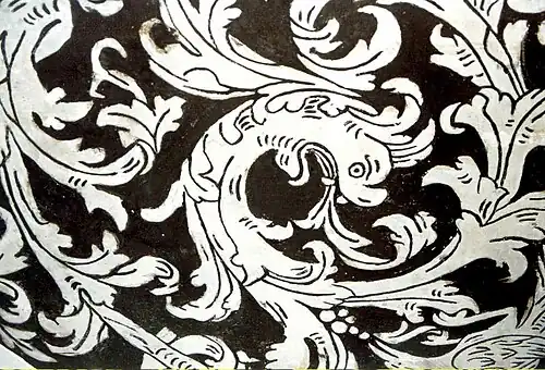 Como los dibujos se hallan perforados en la línea que los define, al pasar el cisquero o muñequilla por la plantilla los dibujos quedan punteados sobre la pared. Después se procedió a hacer el rascado y las incisiones oportunas, desprendiendo la capa superior (contra-trepa) y quedando al descubierto las capas inferiores (trepa), más oscuras. El resultado es la bellísima solución decorativa que actualmente tenemos, perfectamente apreciable, pese a actuaciones posteriores poco acertadas.