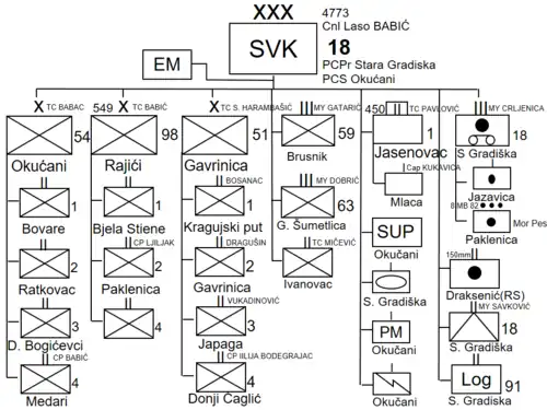 - ↑ Babić, Lazo (22 de abril de 1995). «Zapovijed Komande 18. korpusa SVK podređenim postrojbama da izvrše pripreme za podizanje borbene spremnosti zbog razmještaja pristiglih postrojbi HV-a u zoni odgovornosti Korpusa» [Orden del Comando del 18vo Cuerpo a las unidades subordinadas para prepararse para aumentar la preparación para el combate debido al despliegue de tropas del HV en la zona de responsabilidad del Cuerpo]. edoc.site (en serbocroata). Okučani. Consultado el 10 de julio de 2020.