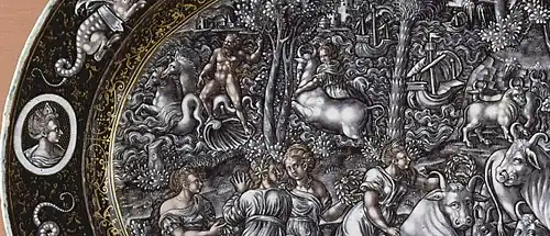 Las composiciones fueron tomadas en su mayoría de impresiones alemanas, francesas o italianas, especialmente para las escenas más grandes con muchas figuras. Los bordes de las piezas más grandes fueron muy elaborados y utilizaron toda la gama de ornamentos manieristas, difundidos por los grabados de decoración y otros modelos. Había muchas lacerías y los fantásticos grotescos recibían a menudo un tratamiento cómico.[39][27][40] Los alegres grotescos ilustrados a la derecha están en el reverso de un gran plato cuya cara principal muestra una representación de colores vivos de la Destrucción del ejército del Faraón en el Mar Rojo.[41] Ambos diseños están estrechamente paralelos, sin ser copiados exactamente, en piezas de otras colecciones, especialmente en una del Museo Metropolitano de Arte de Nueva York. Los diseños también se basaban en grabados, pero adaptados por los esmaltadores para sus piezas.[42]