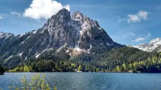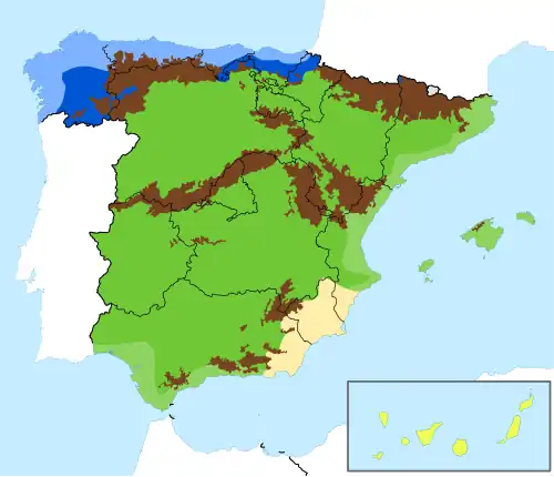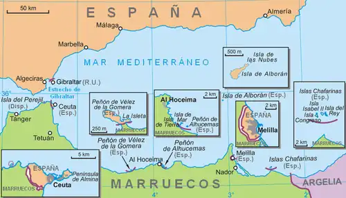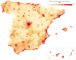 España se sitúa principalmente en el suroeste de Europa, si bien también tiene presencia en el norte de África. En Europa, ocupa la mayor parte de la península ibérica, conocida como España peninsular, y las islas Baleares (en el mar Mediterráneo). En África se hallan las ciudades de Ceuta y Melilla, las islas Canarias (en el océano Atlántico) y varias posesiones mediterráneas denominadas «plazas de soberanía». El municipio de Llivia, en los Pirineos, constituye un exclave rodeado totalmente por territorio francés. Completa el conjunto de territorios una serie de islas e islotes frente a las propias costas peninsulares. Tiene una extensión de 505 370 km2,[11] por lo que es el cuarto país más extenso del continente,[nota 2] y con una altitud media de 650 metros sobre el nivel del mar, uno de los países más montañosos de Europa. Su población se estima en 49,3 millones de habitantes, aunque la densidad de población es reducida si se compara con el contexto europeo.[13][31] Concretamente, a 1 de julio de 2025 llegó hasta los 49 315 949.[13] El territorio peninsular comparte fronteras terrestres con Francia y con Andorra al norte, con Portugal al oeste y con el territorio no autónomo de Gibraltar al sur. En sus territorios africanos, comparte fronteras terrestres y marítimas con Marruecos. Comparte con Francia la soberanía sobre la isla de los Faisanes en la desembocadura del río Bidasoa y cinco facerías pirenaicas.[32]