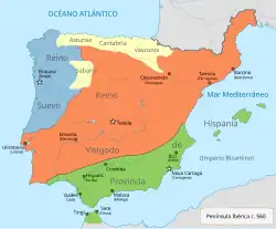 En el año 409 un grupo de pueblos germánicos (suevos, alanos y vándalos) invadieron la península ibérica. En el 416, lo hicieron a su vez los visigodos, un pueblo igualmente germánico, pero mucho más romanizado, bajo la justificación de restaurar la autoridad imperial. En la práctica tal vinculación dejó de tener significación y crearon un reino visigodo con capital primero en Tolosa (la actual ciudad francesa de Toulouse) y posteriormente en Toletum (Toledo), tras ser derrotados por los francos en la batalla de Vouillé (507). Entretanto, los vándalos pasaron a África y los suevos conformaron el reino de Braga en la antigua provincia de Gallaecia (el cuadrante noroeste peninsular). Leovigildo materializó una poderosa monarquía visigoda con las sucesivas derrotas de los suevos del noroeste y otros pueblos del norte (la zona cantábrica, poco romanizada, se mantuvo durante siglos sin una clara sujeción a una autoridad estatal) y los bizantinos del sureste (provincia de Spania, con centro en Carthago Spartaria, la actual Cartagena), que no fue completada hasta el reinado de Suintila en el año 625.