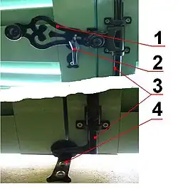 En la fotografía, el brazo de palanca decorativo (1) está articulado para girar 90 grados fuera de un soporte "guardián" metálico (2), y luego se separa de la superficie de la puerta, lo que hace girar la varilla metálica redonda (3), y también el gancho en la parte inferior de la varilla para desenganchar el mecanismo del "tope" metálico (4) montado en el piso y desenganchar así la hoja de la puerta. La varilla, el gancho y el tope en la parte superior de la puerta no se muestran. La hoja de la puerta gira hacia afuera, y este tipo de tope presenta un peligro de tropiezo cuando se usa en el umbral de una puerta.