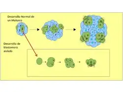 Se han descrito tres modos básicos de compromiso celular. El primero se llama especificación autónoma. En este caso, si se remueve un blastómero particular de un embrión en su desarrollo temprano, ese blastómero producirá el mismo tipo de células que hubiera producido si aún formara parte del embrión. Además, el embrión de donde se tomó el blastómero no tendrá esas células que hubiera producido ese blastómero. La especificación autónoma da origen a un patrón de embriogénesis conocido como desarrollo en mosaico,[3] puesto que parece que el embrión es construido como un mosaico de partes independientes, auto diferenciables. Embriones de invertebrados, especialmente los de moluscos, anélidos, y tunicados, tienen especificación autónoma para determinar el destino de sus células. En estos embriones, los determinantes morfogenéticos (proteínas o RNAmensajeros) son puestos en diferentes regiones del citoplasma del óvulo y son porcionados en las diferentes células mientras el embrión se divide.[2]