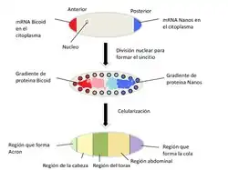 Muchos insectos se basan en la especificación sincitial para comprometer las células a su destino. En embriones tempranos de estos insectos, la división celular no ocurre en su totalidad. El núcleo se divide en el citoplasma del óvulo, creando muchos núcleos dentro de una célula grande. Un citoplasma que tiene muchos núcleos se conoce como sincitio. Sin embargo, el citoplasma del óvulo no es uniforme, pues la parte anterior del citoplasma es marcadamente diferente de la posterior. Aquí, las interacciones de especificación sincitial no ocurren entre células, sino entre las diferentes partes de la misma célula.[4] El caso más conocido de especificación sincitial es el de Drosophila. Experimentos han demostrado que cada núcleo de Drosophila tiene información posicional ( si va formar parte del lado anterior, posterior o mitad del cuerpo) que es dada por proteínas llamadas morfógenos.[1] Los morfógenos son producidos en sitios específicos del embrión, y pueden difundirse a grandes distancias creando gradientes de concentración, donde la mayor concentración es el punto de síntesis y se hace más baja a medida que el morfógeno difunde y degrada con el tiempo. La concentración de morfógenos específicos en un sitio en particular le dice a las células donde están en relación con el sitio de síntesis de estos. La parte más anterior del embrión de Drosophila produce una proteína morfogenética llamada Bicoid, y la parte más posterior produce una proteína llamada Nanos. La concentración de Bicoid es mayor en el lado anterior y disminuye en el posterior, mientras que la proteína Nanos es mayor en el lado posterior y decrece en el anterior. Los núcleos en el citoplasma sincitial de Drosophila serán guiados entonces por la tasa Bicoid:Nanos. Los que se encuentren en regiones con mucho Bicoid y poco Nanos activaran los genes necesarios para producir la cabeza, los que estén en regiones con poco Nanos y poco Bicoid activaran los genes para generar el tórax, y los que se localicen en regiones con poco Bicoid y mucho Nanos formaran las estructuras de la parte abdominal.[5]