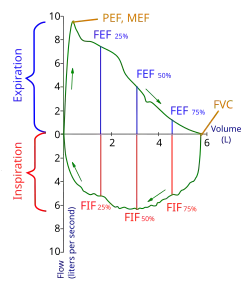 En la espirometría forzada se muestra la velocidad del flujo de aire en función del volumen pulmonar, y se obtienen:[4]
