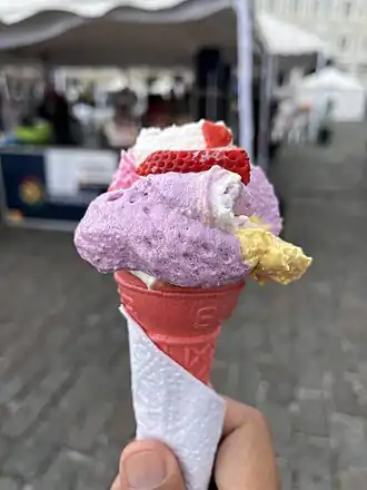 La espumilla es un merengue tradicional ecuatoriano y una popular comida callejera.[1][2] Posiblemente se remonta a 1907, según registros que mencionan su existencia.[1] Está hecha con claras de huevo, azúcar y pulpa de fruta, a menudo de guayaba, y se bate frecuentemente a mano para lograr la textura adecuada.[1] Se asemeja a un helado y se vende a menudo en conos de helado.[1] Originaria del centro de Quito, ahora se vende en toda Ecuador, incluyendo escuelas, plazas y mercados de frutas.[1] La espumilla puede variar en sabor y adornos, a veces se le agrega jarabe de mora ecuatoriano, conocido como arrope de mora.[1] Los dos sabores más comunes en Ecuador son guayaba y mora, aunque también hay de plátano, fresas y naranjilla. Este postre representa una parte del patrimonio culinario ecuatoriano y es popular entre lugareños y turistas.[1] También se encuentra en Venezuela, Guatemala y Nicaragua.[3]
