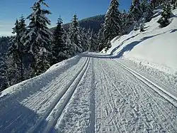- Esquís de montaña: Están diseñados para excursiones de esquí en condiciones naturales de nieve. Las longitudes recomendadas varían entre 150 y 195 centímetros para esquiadores adultos, dependiendo de su estatura y peso. Los esquís de montaña suelen ser más pesados y anchos que los esquís clásicos y de patinaje; a menudo tienen bordes de metal para un mejor agarre en nieve dura; y su mayor corte lateral ayuda a tallar giros.[12][57][58]