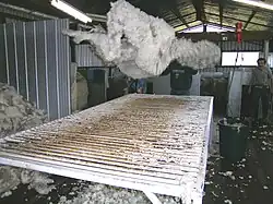 Una vez que se ha quitado todo el vellón de la oveja, el vellón se arroja, con el lado limpio hacia abajo, sobre la denominada "mesa de lana" en un sector del galpón (comúnmente conocido en los cobertizos de Nueva Zelanda y Australia como rouseabout o rousie). El tablero de la mesa de lana consta de listones separados aproximadamente 12 cm. Esto permite que los trozos cortos de lana, las cerraduras y otros desechos se acumulen debajo de la mesa por separado del vellón. A continuación, el vellón es bordeado por uno o más rodillos de lana para eliminar los fribas de sudor y otras partes menos deseables del vellón. Las piezas extraídas consisten en gran parte en lana más corta, sin semillas, con rebabas o polvorienta, que sigue siendo útil en la industria. Como tales, se colocan en contenedores separados y se venden junto con lana de vellón. Otros elementos retirados del vellón sobre la mesa, como heces, fragmentos de piel o ramitas y hojas, se desechan a poca distancia de la mesa de lana para no contaminar la lana y el vellón.
