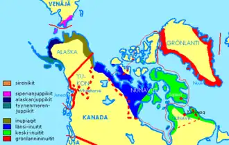 Grupos esquimales: Kalaallit en rojo, inuit oriental en verde claro, inuvialuit en azul, inupiat en verde oscuro, yup'ik en azul oscuro, aluutiq en gris y yuit de Siberia en violeta y naranja.