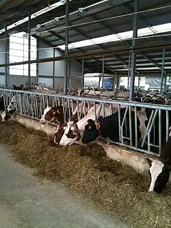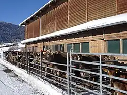 Los edificios de establos de hoy en día son en su mayoría naves con un pasillo de establos y uno o más establos o cajas (corral) para uno o más animales, cada uno con un espacio de alimentación apropiado. Hoy en día, los animales comen durante todo el año o al menos en la estación fría en el establo.