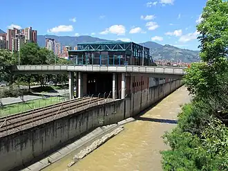 La estación se encuentra en inmediaciones de la Fábrica de Licores de Antioquia y es adyacente al Río Medellín. Además, es cercana al Intercambio Vial La Aguacatala y a la sede de la Universidad EAFIT. Es la última estación del Metro de Medellín dentro del territorio del municipio de Medellín, y se encuentra en la zona industrial de la ciudad.
