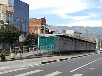 Cuenta con una plataforma central a nivel del suelo que presta servicio a las líneas 1 y 2 de Metroplús. Tiene dos vías exclusivas para buses articulados y padrones impulsados principalmente por gas natural vehicular (GNV).[3]