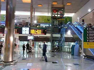 Vista parcial del hall de entrada de la estación desde su puerta principal con el acceso a la segunda planta. En frente, la zona de taquillas.