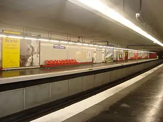 Se compone de dos andenes y de dos vías. No sigue el diseño en bóveda de túnel optando por unas paredes verticales y un techo plano. La estación está revestidas con un azulejo claro, plano y estrecho llamado Miromesnil, dado que fue en esa estación donde se colocó por primera vez. Su presencia es relativamente habitual en las estaciones de las afueras de París. El color, rojo en este caso, se emplea en la zona de asiento y en las paredes de los extremos de cada andén.