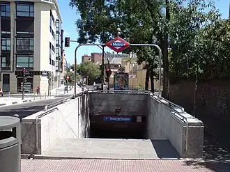 Boca de acceso a la estación con el Palacete de Pastrana al fondo | ||