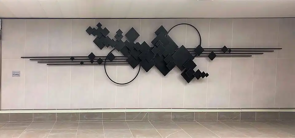 En el vestíbulo principal se encuentra una escultura de hierro "Formas en el Espacio" realizada por el artista Eladio García de Santibáñez (E. G. de Santibáñez) en 1983, y que posteriormente ha sido restaurada y recuperada por el propio autor en enero de 2022 http://www.santibanez-art.com/. El mural, realizado en hierro, está compuesto por barras de cuadradillo de 20 mm de espesor y por piezas cuadradas en palastro de 8 mm de espesor, cortadas a soplete y soldadas entre sí en varias alturas. La escultura tiene unas dimensiones de 6,60 m de longitud x 1,50 m de altura.[4]