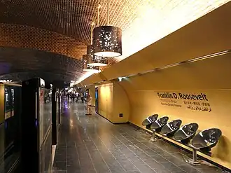 Durante mucho tiempo, más de 60 años, la estación lució uno de los diseños más característicos de la red basándose en un estilo que estuvo en voga en la década de los 50 y de los 60. La idea de base consistía en revestir las estaciones con diversos materiales para alejarse así del sobrio diseño clásico. En Franklin D. Roosevelt el estilo fue llevado aún más allá usando una técnica de manipulación del vidrio llamada gemmail dando lugar a auténticas vidrieras modernas. Tonos verdes y anaranjados, bancos empotrados y señalización en relieve eran otras de las características de la estación.