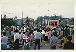 - ↑ この代替に二子新地前駅(→二子新地駅)に渡り線を設けた(当駅の渡り線が再設置された1979年に撤去。[Cambio de denominación de la estación] (en japonés)