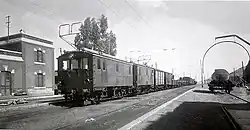 Un convoy de mercancías arrastrado por tracción eléctrica atraviesa la estación, en 1946.