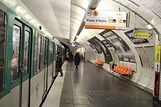Está diseñada en bóveda elíptica revestida completamente de los clásicos azulejos blancos biselados del metro parisino.