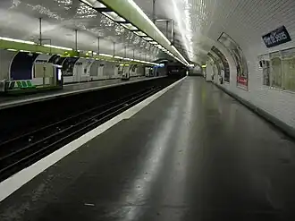 Se compone de tres vías y dos andenes, ordenados de la siguiente forma: v-a-v-v-a. Sigue al pie de la letra el estilo Motte: azulejos blancos biselados cubren toda la estación mientras que el color, en este caso un verde pistacho, se limita a las estructuras que iluminan la misma y a la zona de asiento.