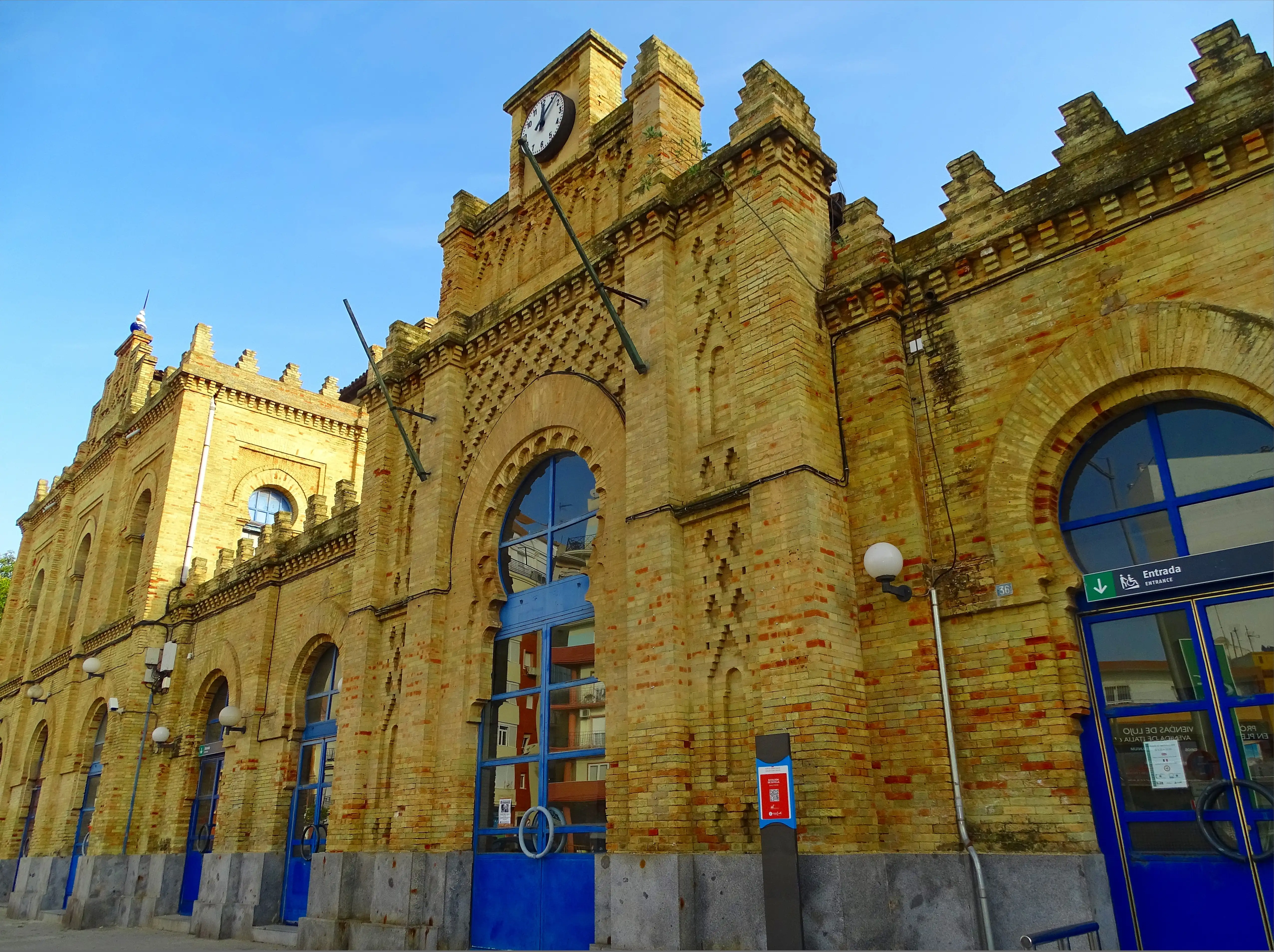 Se trata de un edificio con una composición simétrica de tres cuerpos: el central es de una planta, con cubierta a dos aguas sobre armadura, mientras que los cuerpos laterales disponen de dos plantas; las plantas altas se encontraban destinadas para su uso como viviendas. Está levantado en fábrica de ladrillo visto aplantillado, con formas muy depuradas. El remate superior del edificio está realizado con almenas califales y frontones centrales en neomudéjar aragonés. El zócalo es de granito.