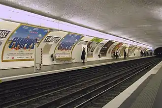 Está diseñada en bóveda elíptica revestida completamente de los clásicos azulejos blancos biselados del metro parisino, con la única excepción del zócalo que es de color marrón. Los paneles publicitarios emplean un marco dorado con adornos en la parte superior.