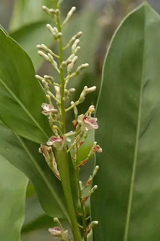 Las flores de Alpinia oxyphylla planta cultivada en la estación para su evaluación, entre sus efectos se incluyen el tratamiento de la flatulencia y efectos protectores de la vejiga hiperactiva de sus frutos. | ||