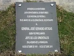 Para la ocasión acudió una delegación de la FIFA para visitar las obras, encabezada por su presidente, Joseph Blatter, y acompañado por Eugenio Figueredo, Nicolás Leoz, Ricardo Texeira y Julio Grondona.[16][62] Dicho monolito fue colocado en la salida del túnel que conecta a los vestuarios con la cancha, y en el año 2011 fue trasladado junto con otros reconocimientos para el nuevo sector, denominado "Quinta de la Paraguaya", que se encuentra en los accesos a la tribuna oficial.[63] Esta plazoleta se inauguró para conmemorar los doscientos años de que José Artigas fuese nombrado como «Jefe de los Orientales», en el terreno donde actualmente se ubica el Parque Central.[64] Años después, otra delegación de la FIFA, encabezada por su presidente Gianni Infantino, visitó el Gran Parque Central, destacando que "es un Estadio mundialista, historia pura"[65] y que "cuando estás en un sitio tan histórico es una emoción muy fuerte".[66]