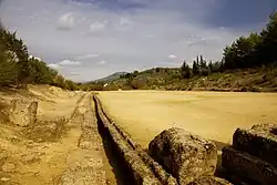 A una distancia de 5,30 m al norte de la pista de salida y a 3,40 m al oeste del eje central de la pista, hay una piedra cuadrada incrustada en el suelo de la pista, que lleva una muesca, tallada en su parte superior. de su superficie. Esto constituye la base de un poste, que se utilizaba en carreras de larga distancia (dólicos). La pista está hecha naturalmente de arcilla gris verdosa, producto de la excavación de un sustrato natural de arcilla sólida.[10]