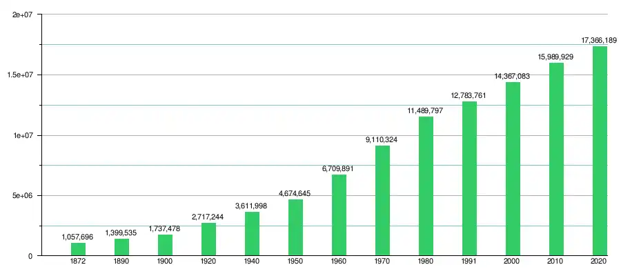 | Población total | 3.611.998 | 4.674.645 | 6.649.646 | 8.994.802 | 11.291.520 | 12.807.706 | 14.391.282 | 15.989.929 |