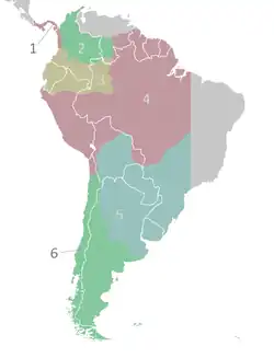 Áreas culturales andinas. En el extremo norte, actual Colombia, en los andes septentrionales compartido por Colombia, Ecuador y Perú, en el centro parte del actual Perú, en el centro sur compartido por Perú, Bolivia, Argentina y Chile, en los andes meridionales compartido por Chile y Argentina al igual que en el extremo sur.