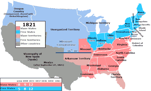 La controversia sobre si Misuri debía ser admitido como estado esclavista, dio como resultado el Compromiso de Misuri de 1820, que especificaba que la compra del territorio de la Luisiana al norte del paralelo 36 ° 30 ', donde se describía la mayor parte de la frontera sur de Misuri, se organizaría como estados libres y los territorios al sur de esa línea serían reservados para la organización como estados esclavistas. Como parte del compromiso, la admisión del Maine (1820) como un estado libre era un seguro para equilibrar la admisión de Misuri como un estado esclavista (1820).