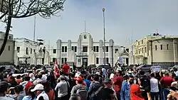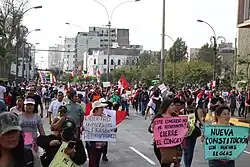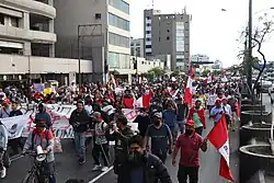 La convulsión social en Perú[19][20][21][22][23][24] o el estallido peruano[25][26][27][28][29][30][d] fue una serie de manifestaciones sucedidas en Perú iniciadas el 7 de diciembre de 2022 (primera etapa de protestas), con interrupciones, hasta mediados de marzo de 2023 (segunda etapa de protestas),[16] mediante el desgaste masivo del evento con anterioridad, enmarcadas en la crisis política que azota al país desde 2021, e inclusive con antecedentes al 2016.[32] Estas protestas comenzaron en las ciudades de Lima, Apurímac, Arequipa y Puno,[33] pero se fueron propagando a lo largo de todo el país.[34] Son convocadas en su mayoría por diversas organizaciones sociales (principalmente sindicales, indígenas, estudiantiles, campesinas) de izquierda política,[35] que a lo largo del tiempo sumarían el apoyo de partidos políticos con espectro ideológico de centro a extrema izquierda.[36] No obstante, las protestas se caracterizan por la carencia de un liderazgo centralizado[37] y la incorporación, en distintos niveles, de un amplio espectro social, principalmente de los sectores más pobres y excluidos del país.[38]