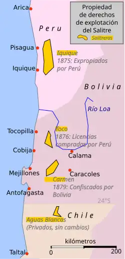 - "Jorge Basadre respecto a este problema económico crucial dice Al realizar el estado peruano con la ley del 28 de marzo de 1875, la expropiación y monopolio de las salitreras de Tarapacá, era necesario evitar la competencia de las salitreras del Toco [in Bolivia].... Aquí es donde se internacionalizaba el conflicto, pues estas salitreras, económicamente estaban en poder de chilenos y británicos"
