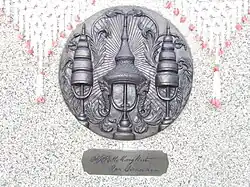 Un paño de color rojo con el escudo real con los emblemas alusivos al Chakra y al Trisula situados en su parte superior. |
