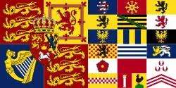 El estandarte real junto a las armas cuarteladas de su abuelo paterno, el duque Jorge de Cambridge, con las de su padre, el duque Francisco de Teck. |
