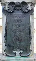 Las cartelas del pedestal (enmarcadas con dos grandes recuadros en granito rojo), obra en su totalidad de Pietro Tacca, se remontan a 1640. En la cartela que mira hacia la basílica se simboliza el original escudo heráldico de Fernando I, formado por un enjambre de abejas con el lema "MAIESTATE TANTUM", que literalmente significa "solamente gracias a su majestad (conseguí gobernar)". La abeja reina está rodeada por círculos concéntricos formados por las otras abejas de la colmena, con lo cual resulta difícil contar su número sin confundirse. La simbología heráldica tiene una alusión muy clara: el gran duque en el centro (la abeja reina) que no infunde ningún temor, rodeado del pacífico pueblo florentino representado por las abejas obreras.