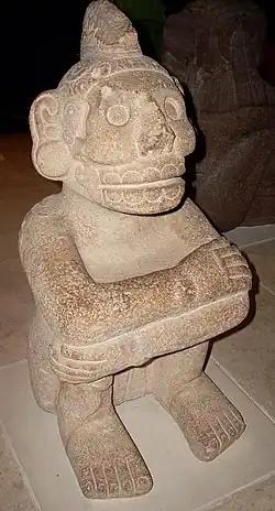 La escultura representa a Mictlantecuhtli, (palabra Nahuatl que significa señor del inframundo) es el dios azteca, zapoteca y mixteca del inframundo y de los muertos (no tenían concepto católico del infierno), también era llamado Popocatzin (de "popoca" 'fumar'), por lo tanto era el dios de las sombras. Juntamente con su esposa Mictecacíhuatl, regía el mundo subterráneo o reino de Mictlán. Ejercía su soberanía sobre los "nueve ríos subterráneos" y sobre las almas de los muertos. Se le representa como el esqueleto de un humano con una calavera con muchos dientes. Asociado con las arañas, los murciélagos y los búhos, al ser dibujado se representaba con cabello negro y con ojos estelares o estrellas.