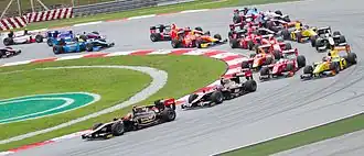 Gutiérrez detrás de su compañero James Calado en la primera curva de la carrera de GP2 de Malasia del 2012.