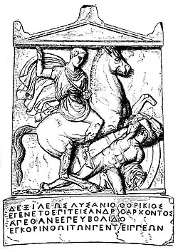 ![]() El soldado de caballería ateniense Dexíleo luchando contra un hoplita desnudo del Peloponeso en la guerra de Corinto.[1] Dexíleo murió en combate cerca de Corinto en el verano del 394 a. C., probablemente en la Batalla de Nemea,[1] o en un combate cercano.[2] | ||