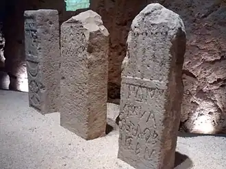 Las estelas tienen inscrito el nombre del difunto en escritura ibérica nororiental, desde una forma simple hasta una expresión más elaborada. La escritura ibérica está descifrada, pero la lengua ibérica permanece en gran parte incomprensible. Sin embargo, se han hecho progresos en el campo de la antroponimia, tanto por el contexto como por la estructura léxica. El estudio del bronce de Ascoli, con una relación en latín de unos 30 nombres ibéricos, pone de manifiesto que los nombres personales tienen segmentos lexicales que se repiten. Los nombres personales ibéricos son bimembres, es decir, que están compuestos por dos formantes normalmente bisílabos o monosílabos. Estos formantes se combinan libremente, como primer o como segundo componente, para formar los nombres personales. Jürgen Untermann identificó 141 formantes antroponímicos.[7] Por ejemplo, el famoso caudillo Indíbil, en latín Indibil, está compuesto por los formantes conocidos «inti + bilis».