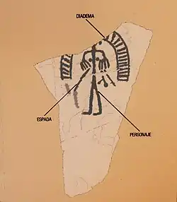 Al ser una figura diademada indica que es una representación femenina, máxime si se tiene en cuenta que los dos puntos que aparecen a la altura del pecho pueden significar los pechos de una mujer.[24] La composición dibujada es la de una figura humana con varios objetos a derecha e izquierda y rodeada en la parte superior por dos semicírculos concéntricos compartimentados mediante trazos radiales semejantes a una diadema. El trazo es ancho está ejecutado mediante la técnica del «repiqueteado» que lo deja bien concreto. Carece de cabeza ya que es trozo que falta es el que corresponde a ella. A la derecha de la figura aparece un punto que podría ser un pendiente. El tronco es rectilíneo y paralelo a la dimensión mayor de la pieza. Del tronco salen líneas que se asemejan a los hombros y luego descienden hasta terminar en unas manos gruesas y de cuatro dedos cada una; tiene las piernas ligeramente separadas con los piés hacia la derecha del personaje.[25]