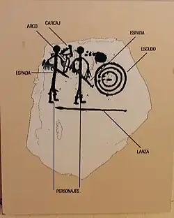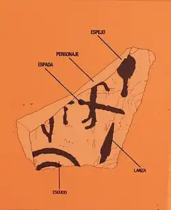A la derecha del escudo hay una línea que puede figurar una espada y en la parte superior una lanza en posición casi horizontal. Bajo esta y sobre la cabeza de la figura humana central hay lo que podría considerarse como un espejo, así como otros puntos descendentes de difícil interpretación. Bajo la figura humana central y a la izquierda de la inferior se ven varios trazos paralelos de lo que podría ser una parte del tiro o de la caja de un carro.[29]