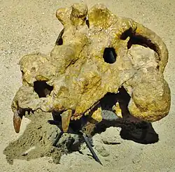 Esta especie se caracteriza por cuernos que se proyectan hacia arriba y abajo a ambos lados de la cabeza. La boca contenía grandes caninos con pequeños molares.