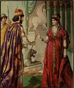 - Y al tercer día, Ester se vistió con sus ropas reales y se presentó en el patio interior de la casa del rey, frente a la casa del rey, y el rey estaba sentado en su trono real en la casa real, frente a la puerta de la casa.”'[12]