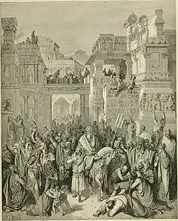Amán ideó un honor inusualmente alto para «el hombre a quien el rey se complace en honrar», pero el rey, sin reflexionar, aceptó inmediatamente el consejo, solo para ordenar a Amán que lo llevara a cabo con «Mardoqueo el judío», lo que sin querer supuso una humillación adicional para Amán.[10] La mención de «el judío» indica que el rey no relaciona al pueblo judío con el edicto de destrucción que aprobó apenas unos días antes.[10]