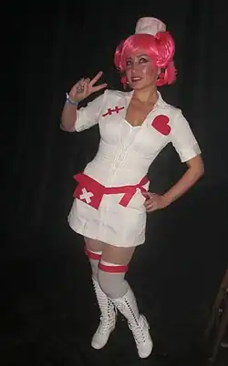 Los antiguos uniformes enfermeros: falda blanca, cofia y capa; es a menudo usado como parte de este estereotipo. [1]