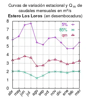 La subcuenca baja del río Aconcagua, que comprende desde la junta del estero Pocuro hasta la desembocadura del río Aconcagua en el océano Pacífico, incluyendo el estero Catemu y a Los Loros, tiene un régimen nivo–pluvial con las mayores aumentos de caudal en diciembre y enero producto de deshielos. Los menores caudales ocurren en el trimestre marzo-mayo.[2]: 61