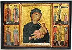 Los soportes de la pintura italiana hasta 1200 eran fundamentalmente manuscritos iluminados, frescos, cruces triunfales de madera de grandes dimensiones que se exhibían en las iglesias y pequeños paneles para ornamentar piezas de mobiliario. Los crucifijos de tamaño natural no eran una tradición bizantina, y en Italia se veían probablemente como una versión más económica de los esculpidos (denominados en latín corpus -"cuerpo"-).[37] Entre las versiones escultóricas está la Cruz de Gero (Colonia, siglo X), la Santa Faz de Lucca (siglo XI o anterior) y la Majestad Batlló (Pirineo catalán, siglo XII). Los crucifijos pintados incorporaban figuras de menor tamaño en los cuatro extremos de la cruz, como en la cruz de la catedral de Sarzana (Crucifijo del Maestro Guglielmo,[38] 1138, la pintura de datación más antigua de la escuela toscana).[39]